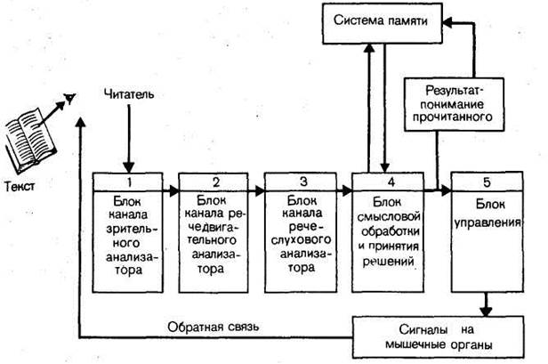Как и в любом подобного рода объекте управления, здесь есть каналы обратной связи. Обратной связью в системах управления называют корректирующие воздействия выхода системы на ее вход. В нашем случае канал обратной связи реализуется выдачей сигнала о принятом корректирующем решении (в результате осмысления текущего фрагмента текста) каналу зрительного анализатора: “Остановись”, “Читай дальше”, “Вернись” (в отличие от общей команды “Читай, читай, читай”). Итак, чтение в системе “человек — текст” представляет собой процесс управления несколькими процессами, где: — текст — объект восприятия и познания заложенной в нем содержательной информации; — головной мозг — перерабатывающее и управляющее устройство. В соответствии с описанной структурной моделью сам процесс чтения можно представить следующим образом. Читатель схватывает взором определенный фрагмент текста, который далее начинает обрабатываться в канале зрительного анализатора. Происходит сложнейший процесс переработки полученного текстового сообщения, причем производится не только зрительный, но и речеслуховой и речедвигательный анализ. В результате такой традиционной трехступенчатой обработки информации принимается определенное решение: в блоке смысловой обработки — команда на выполнение регрессии или на считывание следующего фрагмента текста либо команда мышцам руки на перевертывание страницы, или команда не приостановку чтения. Отдавая себе отчет в крайней условности и приближенности; рассмотренной структуры — функциональной модели процесса чтения, мы тем не менее считаем ее осознание полезным для читателей этой книги. Как установили ученые, чтение есть одновременный процесс приема и выдачи речи. Это означает, что при чтении письменная речь (текст) вначале принимается (считывается) зрительным анализатором, но основное усвоение прочитанного непременно сопровождается внутренними речевыми процессами, в которых принимает участие и слуховой анализатор. И именно от того, как эти процессы организованы, какова степень их согласованности, и зависит скорость чтения. Если при чтении возникает так называемая внешняя артикуляция — проговаривание вслух или шепотом того, что читается, и тут же внутреннее прослушивание, то в этих случаях перерабатывают информацию все три блока: зрительный, речедвигательный, речеслуховой. Иначе говоря, текст в этом случае зрительно воспринимается, проговаривается и прослушивается. Таким традиционным способом читают почти все читатели. Однако такая многоступенчатая обработка текста не всегда обязательна и, кроме того, прочитанное не усваивается лучше. Чтение с проговариванием напоминает движения ребенка, который учится ходить: осторожно, неуверенно нащупывается каждый следующий шаг. Вы читаете букву за буквой, слог за слогом, слово за словом. При таком чтении восприятие и осмысление больших фрагментов текста, выделение их логических элементов затруднено. Образно говоря, за деревьями слов читатель не видит леса смысла. С точки зрения кибернетики, медленный темп чтения в этом случае можно объяснить только низкой пропускной способностью речеслухового канала в целом из-за его инерционности. Действительно, скорость нашей речи невелика — 150 сл./мин — вот предел, выше которого она становится невнятной. 150 сл./мин — э