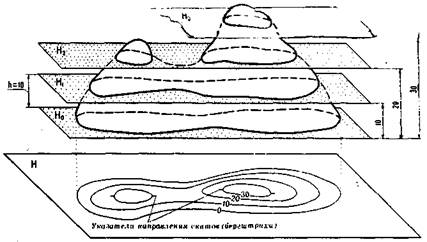 В России высоты точек земной поверхности для составления карт определяют относительно среднего уровня Балтийского моря в Кронштадте(нуль Кронштадского водомерного поста). Высоты точек земной поверхности над уровнем моря называют абсолютными высотами. Превышение одной точки относительно другой называют относительной высотой. Относительную высоту любой точки можно вычислить по имеющимся абсолютным высотам, которые определяют в результате геодезических и топографических работ. Благодаря применению горизонталей, отображающих рельеф, карта дает представление о трехмерном изображении местности. На рисунке показан принцип изображения рельефа горизонталями. Топографическую поверхность пересекают горизонтальными плоскостями Н0, Н1, Н2, Н3 на заданных абсолютных высотах 0, 10, 20 и 30 м. Интервалы между смежными секущими плоскостями называют высотой сечения. В данном примере высота п сечения 10 м. На топографической карте и плане рельеф изображают проекциями горизонталей(в соответствующем масштабе), которые также называют горизонталями. Горизонтали сопровождают числовыми отметками, указывающими высоту точек этой линии. Числовые отметки называют абсолютными, если они указывают высоту от уровенной поверхности, и относительными, если они указывают высоту от какой-либо другой поверхности.