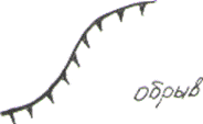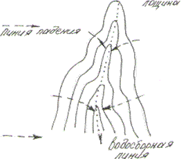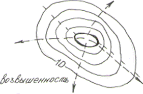 Возвышенности и впадины различаются направлением возрастания отметок горизонталей. Высоты горизонталей у возвышенности возрастают от внешней горизонтали к внутренней, а у впадин они, наоборот, убывают в том же направлении. Направления ската определяют линии падения, т. е. наибольшей крутизны, направленные перпендикулярно горизонталям (по нормалям). Ниже на рисунке они показаны штриховой линией со стрелкой на конце.