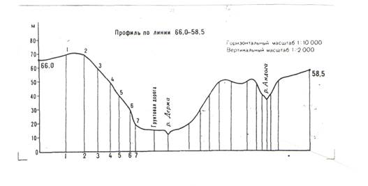 Планы и карты благодаря проекциям с числовыми отметками позволяют устанавливать количественные характеристики рельефа: высоту сечения, крутизну склона (угол наклона ската или его уклон), заложение. Кроме того, они позволяют решать практические задачи: проектировать линии с заданной крутизной, например, для прокладки трассы дороги, водопровода, сточного или оросительного канала, определять водосборную площадь (бассейн), т.е. участок, с которого собирается снеговая и дождевая вода в данный водосток, оконтуривать площадь затопления, строить профиль местности, определять границы земляных работ и др. Для построения профиля местности на карте проводят прямую линию в направлении профиля и определяют максимальную минимальную отметки точек местности на этой линии. Разность отметок определяет амплитуду высот профиля, которая необходима для выбора масштаба высот. Затем на специальной миллиметровой (профильной) бумаге проводят две взаимно перпендикулярные прямые – горизонтальную и вертикальную оси профиля. На вертикальной оси строят шкалу высот в выбранном масштабе, а на горизонтальной – последовательно откладывают заложения местности, определяемые расстояниями между горизонталями на карте. Если горизонтальный масштаб профиля и карты одинаков, то заложения переносят с карты циркулем или посредством полоски бумаги. Из полученных на горизонтальной оси точек проводят перпендикуляры, на которых отмечают высоты местности, используя шкалу высот. Найденные точки последовательно соединяют плавной кривой.