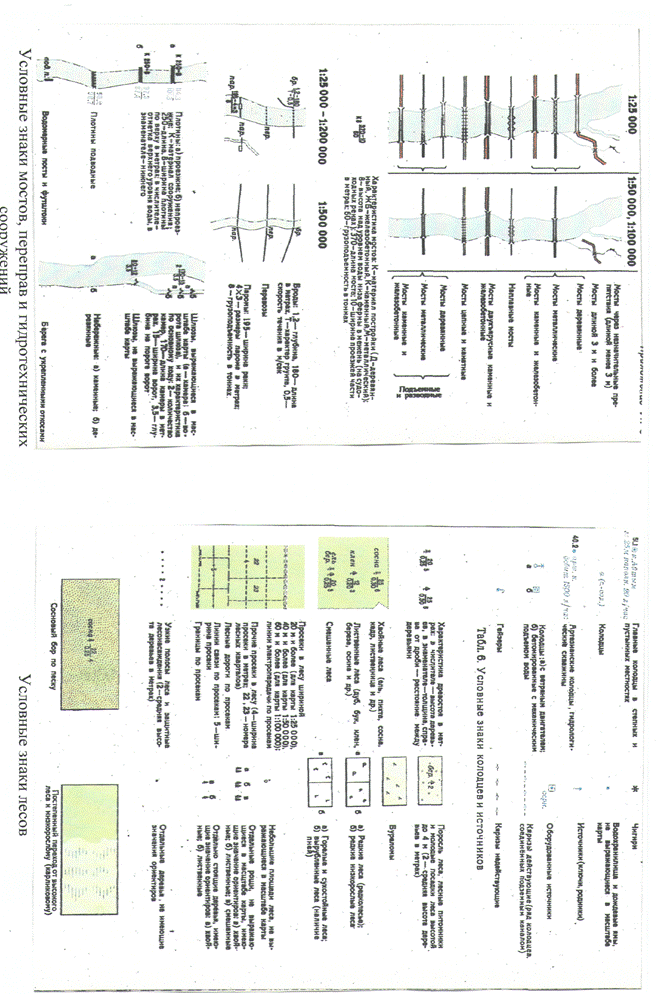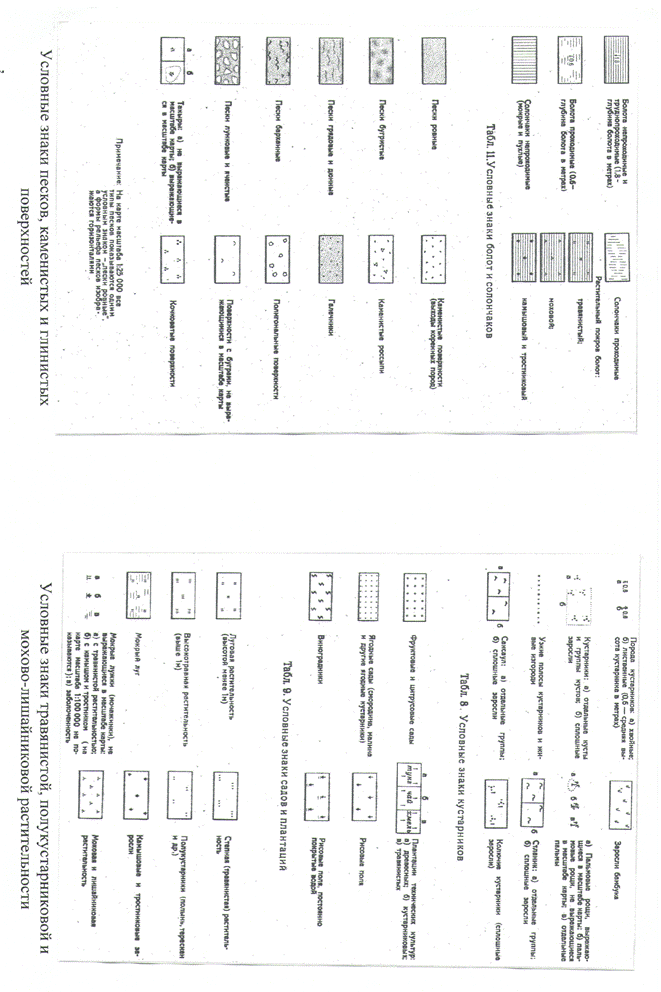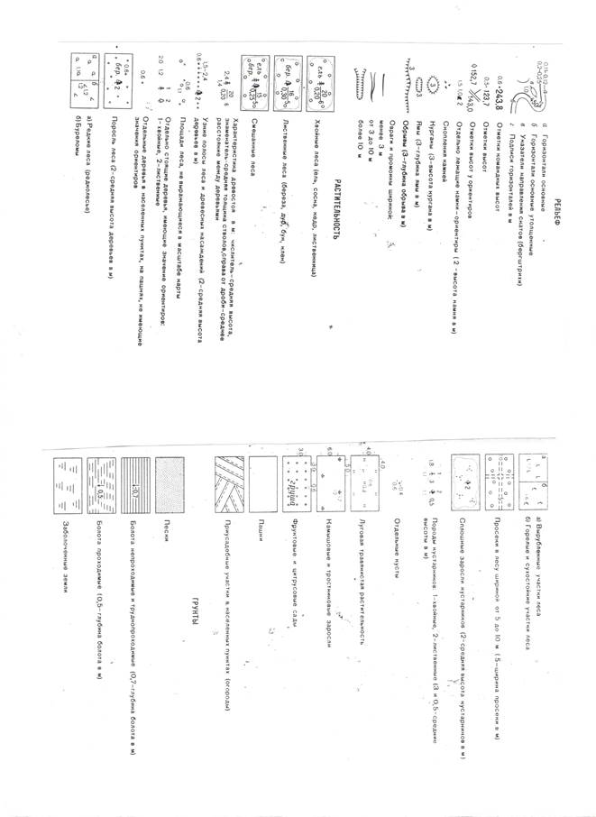 Читать карту – это значит правильно и полно воспринимать символику ее условных знаков, быстро и безошибочно распознавая по ним не только тип и разновидности изображаемых объектов, но и их характерные свойства. Наряду с этим процесс чтения карты включает также глазомерное восприятие пространственных соотношений между рассматриваемыми на ней объектами. Эти знания приобретают в результате упражнений в чтении карт разных масштабов и путем вычерчивания условных знаков и фрагментов карт. Перечерчивают карты разными способами.Один из них заключается в копировании карты тушью на кальку с последующим переносом на чертежную бумагу. Копирование карты с изменением масштаба выполняют посредством фотографирования или специального прибора - пантографа. Чтение топографической карты заключается в определении формы рельефа местности, определении растительного покрова, гидрографии (рек, озер, болот и пр.), дорог и других коммуникаций, населенных пунктов, расположенных на местности, и в определении их характеристик. Рекомендуемая последовательность чтения топографической карты: 1. Определяют масштаб изображения (численный и линейный), указываемый под нижней (южной) линией рамки. 2. Находят по условны м обозначениям дороги, мосты, поселки, заводы и другие объекты, определяют их тип. 3. Устанавливают наличие линий связи, высоковольтных линий электропередач и других коммуникаций. 4. Определяют по условным обозначениям растительный покров: занимаемую площадь, породу деревьев их размер и частоту, наличие кустарников, лугов, огородов, и пр. 5.Выполняют гидрографию (реки, болота, озера и др.), устанавливают их полную характеристику. 6. Определяют характер рельефа (гористость) местности: а) отметки наиболее возвышенных мест; б) расстояния между горизонталями, наличие крутых и пологих склонов; в) наличие седловин, хребтов, лощин, оврагов, обрывов, и др.; г) изменение рельефа местности при движении в заданном направлении (например, по имеющейся на карте дороге или вдоль линии электропередачи и т. п.)