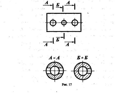 На чертеже одной детали может быть столько различных сечений, сколько нужно для полного выявления её формы. Дня нескольких одинаковых сечений, относящихся к одному и тому же предмету, следует линии сечения обозначать одной и той же буквой и вычерчивать одно сечение (рис. 17).