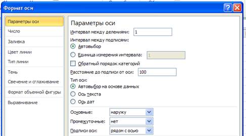 Можно отдельно форматировать следующие элементы диаграммы: область диаграммы; - область построения, - ряд данных (набор связанных между собой элементов данных, отображаемых на диаграмме. Каждому ряду данных на диаграмме соответствует отдельный цвет или способ обозначения, указанный на легенде диаграммы. Диаграммы всех типов, кроме круговой, могут содержать несколько рядов данных.; - оси; - названия; - подписи данных; - легенду (в легенде отображается список имен элементов данных, отображаемых на диаграмме и соответствующие им цвета). Для форматирования используется вкладка Макет. Выбранные параметры макета будут применены к выделенному элементу. Например, если выделена вся диаграмма, метки данных будут применены ко всей последовательности данных. Если выделена единственная точка данных, метки данных будут применены только к выделенной последовательности данных или к выделенной точке данных. Для форматирования оси необходимо выполнить двойной щелчок и в появившемся диалоговом окне «Формат оси» (рисунок 3) установить необходимые параметры.