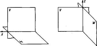 Рис. 1.11 Рис. 1.12 дроби V/H. Плоскости ¥и Н образуют систему V, Н. (Наряду с указанными обозначениями плоскостей проекций в литературе применяют и другие обозначения, например буквой л с индексами.) Плоскости проекций, пересекаясь, образуют четыре двугранных угла, из которых приведенный на рисунке 1.11 (с обозначениями граней V, Н) считают первым. В промышленности чертежи многих деталей выполняют также в системе двух взаимно перпендикулярных плоскостей, пересекающихся по вертикальной оси проекций z (рис. 1.12). При этом фронтальной плоскостью проекций оставляют также плоскость V, а перпендикулярную к ней и обозначаемую W называют профильной плоскостью проекций. В системе двух взаимно перпендикулярных плоскостей проекций горизонтальной проекцией точки называют прямоугольную проекцию точки на горизонтальной плоскости проекций; фронтальной проекцией точки называют прямоугольную проекцию точки на фронтальной плоскости проекций. Наглядное изображение построения проекций произвольной точки А в системе V, Н показано на рисунке 1.13. Горизонтальную проекцию, обозначенную а, находят как пересечение перпендикуляра, проведенного из точки А к плоскости Н, с этой плоскостью. Фронтальную проекцию, обозначенную а', находят как пересечение перпендикуляра, проведенного из точки А к плоскости V, с этой плоскостью. Проецирующие прямые Аа' и Аа, перпендикулярные к плоскостям V и Н, принадлежат плоскости Q. Она перпендикулярна плоскостям проекций и пересекает ось проекций в точке ах. Три взаимно перпендикулярные плоскости Q, Vi/i /Гпересека-