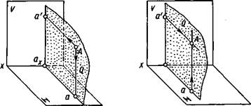 Рис. 1.13 Рис. 1.14 ются по взаимно перпендикулярным прямым, т. е. прямые а'ах, аахи ось х взаимно перпендикулярны. Построение некоторой точки А в пространстве по двум заданным ее проекциям — фронтальной а' и горизонтальной а — показано на рисунке 1.14. Точку А находят на пересечении перпендикуляров, проведенных из проекции а' к плоскости V и из проекции а к плоскости Н. Проведенные перпендикуляры принадлежат одной плоскости Q, перпендикулярной к плоскостям V и Н, и пересекаются в единственной искомой точке А пространства. Таким образом, две прямоугольные проекции точки вполне определяют ее положение в пространстве относительно данной системы взаимно перпендикулярных плоскостей проекций. В дальнейшем прямоугольные проекции точки в системе взаимно перпендикулярных плоскостей проекций будем называть ортогональными проекциями точки. Рассмотренное наглядное изображение точки в системе V, Н неудобно ввиду своей сложности для целей черчения. Преобразуем его так, чтобы горизонтальная плоскость проекций совпадала с фронтальной плоскостью проекций, образуя одну плоскость чертежа. Это преобразование осуществляют (рис. 1.15) путем поворота вокруг оси х плоскости Н на угол 90° вниз. При этом отрезки ах= а' и ах = а образуют один отрезок а'а, перпендикулярный оси проекции, называемый линией связи. В результате указанного совмещения плоскостей V и Н получается чертеж — рисунок 1.16, известный под названием эпюр (от французского ерше — чертеж, проект) или эпюр Монжа. Этот чертеж в системе V, Н (или в системе двух прямоугольных проекций) называют