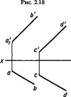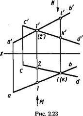 Рис. 2.22 находится ближе к наблюдателю, и при проецировании на плоскость Гточка 1 прямой АВ закрывает точку 2 прямой CD (фронтальная проекция 2' точки 2 показана в скобках). Рассмотренные точки скрещивающихся прямых, проекции которых на одной из плоскостей совпадают, в литературе иногда называют конкурирующими точками.