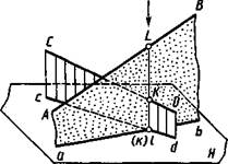 Скрещивающиеся прямые. Скрещивающиеся прямые не имеют общих точек. Наглядное изображение двух скрещивающихся прямых АВ и CD общего положения дано на рисунке 2.22, их чертеж — на рисунке 2.23. С точкой пересечения одноименных проекций аЪ и cd (рис. 2.22) совпадают проекции к и / двух точек К и L, принадлежащих различным прямым CD и АВ. Точки пересечения одноименных проекций скрещивающихся прямых не лежат на одной линии связи (рис. 2.23). Интересен вопрос: какая из изображенных на чертеже прямых выше другой или ближе другой к наблюдателю? Это определяют путем анализа положения определенных точек этих прямых. На рисунке 2.22 видно, что при взгляде сверху по указанной стрелке точка L на прямой АВ закрывает точку К (проекция точки К на плоскости Н показана поэтому в скобках). Соответственно и на чертеже, приведенном на рисунке 2.23, видно, что фронтальная проекция /' выше фронтальной проекции к', и при взгляде сверху по стрелке N при проецировании на плоскость # точка L закрывает точку К (горизонтальная проекция к показана в скобках). На плоскости V совпадают фронтальные проекции Г и 2' точек прямых АВ и CD. При взгляде спереди по стрелке М видно, что точка 1 прямой АВ