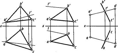 К числу основных задач, решаемых на плоскости, относят: проведение любой прямой в плоскости, построение в плоскости некоторой точки, построение недостающей проекции точки, проверка принадлежности точки плоскости. Решение этих задач основывается на известных положениях геометрии: прямая принадлежит плоскости, если она проходит через две точки, принадлежащие плоскости, или через одну точку этой плоскости параллельно прямой, лежащей в этой плоско- зз сти или ей параллельной. При этом используется известное условие, что если точка принадлежит плоскости, то ее проекции лежат на одноименных проекциях прямой, принадлежащей плоскости. Проведение любой прямой в плоскости. Для этого достаточно (рис. 3.10) на проекциях плоскости взять проекции двух произвольных точек, например а', а и Г, 1, и через них провести проекции а'Г, а—1 прямой А— 1. На рисунке 3.11 проекции Ь'Г, Ъ— 1 прямой В— 1 проведены параллельно проекциям а'с', ас стороны А С треугольника, заданного проекциями а'Ъ'с', abc. Прямая В— 1 принадлежит плоскости треугольника ABC. Построение в плоскости некоторой точки. Для построения в плоскости точки в ней проводят вспомогательную прямую и на ней отмечают точку. На чертеже (рис. 3.12) плоскости, заданной проекциями а', а точки, b'c', be прямой, проведены проекции а'Г, а—1 вспомогательной прямой, принадлежащей плоскости. На ней отмечены проекции d', d точки D, принадлежащей плоскости. Построение недостающей проекции точки. На рисунке 3.13 плоскость задана проекциями а'Ъ'с', abc треугольника. Принадлежащая этой плоскости точка D задана проекцией а". Следует достроить горизонтальную проекцию точки D. Ее строят с помощью вспомогательной прямой, принадлежащей плоскости и проходящей через точку D. Для этого проводят, например, фронтальную проекцию Ъ'1'd' прямой, строят ее горизонтальную проекцию Ъ—1 и на ней отмечают горизонтальную проекцию d точки.