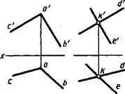 Построение взаимно параллельных прямой линии и плоскости. Известно, что если прямая линия (АВ, рис. 4.14) параллельна прямой KL, лежащей в плоскости, то она параллельна этой плоскости. Для построения прямой, проходящей через заданную точку пространства параллельно заданной плоскости, достаточно провести прямую, параллельную любой прямой, принадлежащей плоскости. При этом возможно бесчисленное множество решений. Дополнительные требования могут обусловить единственное решение. В качестве примера на рисунке 4.15 показано построение проекций прямой линии, проходящей через точку с проекциями к', к, параллельной плоскости треугольника с проекциями a'b'c', аЪс и параллельной плоскости V — дополнительное требование. В плоскости треугольника проведена фронталь с проекциями а'Г, а—1. Проекции искомой прямой проведены через проекции к', к точки параллельно проекциям фрон-тали к'1'\\а'Г, kl\\a-l. Для того чтобы проверить, параллельна ли прямая заданной плоскости, можно попробовать провести в этой плоскости прямую, параллельную заданной. Если такую прямую в плоскости построить не удается, то заданные прямая и плоскость не параллельны между собой. Можно также попытаться найти точку пересечения данной прямой с данной плоскостью. Если такая точка не может быть найдена, то заданные прямая и плоскость взаимно параллельны.