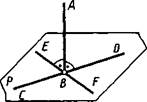Прямой и плоскости, двух плоскостей Построение взаимно перпендикулярных A) Рис. 4.16 мощью главных линий плоскости — горизонталей и фронталей. На рисунке 4.16, б плоскость Р задана проекциями a'b', c'd' и ab, cd параллельных прямых. Параллельная ей плоскость Т должна проходить через точку с проекциями к', к. Проекции плоскости Т построены с помощью фронтальных проекций k'f фронтали и k'g' горизонтали и горизонтальных проекций kg горизонтали и kf фронтали. При этом k'f | ГЗ', kg 1 1—2. Перпендикуляр к плоскости перпендикулярен к любой прямой, проведенной в этой плоскости (на рис. 4.17 (АВ)±Р, (AB)±(DC), (AB)±(EF)). Из множества этих прямых при построении перпендикуляра к плоскости на чертеже выбирают фронталь и горизонталь плоскости, так как при этом образуются прямые углы, одна из сторон которых параллельна плоскости проекций.
