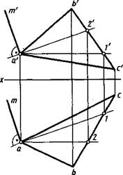 кости треугольника с проекциями a'b'c', abc, приведен на рисунке 4.18. Фронтальная проекция а'т' прямой построена перпендикулярно фронтальной проекции а'2' фронтали, горизонтальная проекция от — перпендикулярно горизонтальной проекции а— /горизонтали плоскости.