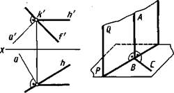 В этом случае на чертеже фронтальную проекцию перпендикуляра проводят под углом 90° к фронтальной проекции фронтали, а горизонтальную проекцию перпендикуляра — под углом 90° к горизонтальной проекции горизонтали (см. 1.3). Пример построения проекций а'т',