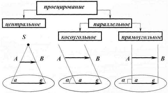 Центральное и параллельное проецирование. В начертательной геометрии прежде всего следует усвоить некоторые термины: плоскость проекций — та плоскость, на которой строится изображение предмета; проекция — изображение предмета на плоскости, полученное с помощью прямых линий, проведенных через множество точек на поверхности предмета до пересечения их с плоскостью проекций; проецирование — процесс образования проекций; проецирующая прямая (или луч) — прямая, проведенная через точку на поверхности предмета по заданному направлению до пересечения с плоскостью проекций.
