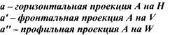 а б Рис. 2. Пространственная модель координатных плоскостей Горизонтальная плоскость проекций — горизонтальная плоскость, на которой располагается наблюдатель (Н). Фронтальная плоскость проекций — вертикальная плоскость перед наблюдателем (V). Первой четвертью I считается часть пространства, где обе плоскости проекций видимы наблюдателю. Профильная плоскость проекций (W) — вертикальная плоскость, находящаяся справа от наблюдателя. Плоскости H, V, W делят пространство на 8 частей, называемых октантами. Обычно пользуются первым октантом, где координаты по осям имеют положительное значение (рис. 2, б). Проецирование точки и прямой. Прямоугольная проекция точки — это основание перпендикуляра, опущенного из точки на плоскость проекций. Проекция точки на плоскость H называется горизонтальной проекцией точки (а); на плоскость V — фронтальной проекцией точки (а'); на плоскость W — профильной проекцией точки (а'') — рис. 3, а. Для построения проекций прямой линии достаточно построить проекции ее концевых точек. Прямая линия на плоскостях проекций может быть задана двумя способами: – проекциями двух точек, принадлежащих прямой; – проекциями отрезка прямой. На рис. 3, б показаны проекции прямой АВ на горизонтальную плоскость проекций (ab); на фронтальную плоскость проекций (a'b'); на профильную плоскость проекций (a''b''). Проекции и точки и прямой определяются проецирующими линиями (проецирующими лучами), проведенными из соответствующих точек на плоскости проекций.
