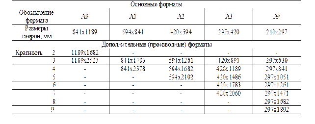 Форматы Все конструкторские документы выполняют на листах бумаги, форматы которых определены в ГОСТ 2.301-68 для всех отраслей промышленности и строительства. Форматы листов определяются размерами внешней рамки. Формат с размерами сторон 841х1189 мм имеет площадь, равную 1 м2, и принят за основу. Другие основные форматы получаются последовательным делением этого формата на две равные части, параллельно меньшей его стороне. Обозначения и размеры сторон основных форматов должны соответствовать указанным в табл. 1. Допускается применять формат А5 с размерами сторон 148х210 мм. Допускается применение дополнительных форматов, образуемых увеличением коротких сторон основных форматов на величину, кратную их размерам. Обозначение дополнительного (производного) формата составляется из обозначения основного формата и его кратности, например: А0х2, А4х8. Обозначение формата характеризует только величину листа, но не его ориентацию. Формат А4, в отличие от других, ориентирован всегда вертикально (рис. 56).