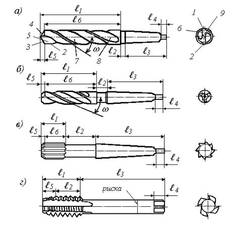 Рис. 3.2. Инструменты для обработки отверстий: а) — спиральное сверло с коническим хвостовиком; б) — хвостовой зенкер; в) — хвостовая машинная развёртка; г) — метчик На направляющей части сверла вдоль винтовой канавки расположены две узкие ленточки 1 и 2, обеспечивающие заданное направление движению сверла при резании. Хвостовик ℓ3 необходим для установки сверла в шпинделе станка. Лапка ℓ4, расположенная в конце хвостовика, служит упором при выбивании сверла из отверстия шпинделя. Зенкер. По своей конструкции зенкеры бывают цельными и сборными, насадными и хвостовыми. На рисунке 3.2, б изображен цельный хвостовой зенкер. Основными его элементами являются рабочая часть ℓ1, состоящая из режущей ℓ5 и калибрующей ℓ6 частей, шейка ℓ2, хвостовик ℓ3 и лапка ℓ4. Хвостовой зенкер в отличие от спирального сверла имеет три или четыре режущих лезвия (зуба) с режущими кромками, расположенными на режущей части, и не содержит поперечной кромки. Увеличение точности обработки отверстия, достигаемое зенкером, обеспечивается его большей, чем у сверла, жёсткостью и меньшей глубиной резания. Развёртка —инструмент для чистовой обработки отверстий. Основное отличие развёртки (рис. 3.2, в) от зенкера заключается в том, что она имеет большее число режущих лезвий (зубьев), от 6 до 14, которые, срезая небольшие слои материала, обеспечивают повышенный по отношению к обработке зенкером квалитет точности диаметра отверстия. Развёртки подразделяют на машинные и ручные. Ручные развёртки предназначены для обработки отверстий вручную. Машинные развёртки по способу установки на станке делят на хвостовые и насадные, по конструкции рабочей части — на цельные и сборные. Конструктивными элементами хвостовой развёртки, представленной на рисунке 3.2, в, являются рабочая часть ℓ1, шейка ℓ2, хвостовик ℓ3 и лапка ℓ4. На рабочей части развёртки, также как у сверла и зенкера, выделяютрежущую ℓ5 и калибрующую ℓ6 части. Метчик (рис. 3.2, г) — инструмент, используемый для нарезания внутренних резьб. Метчик представляет собой винт с прорезанными прямыми или винтовыми канавками, образующими режущие кромки. Метчики подразделяют на ручные и машинные. На рисунке 3.2, г изображён ручной метчик, предназначенный для ручного нарезания резьбы. Рабочая часть метчика ℓ1 имеет режущую ℓ5 и калибрующую ℓ2 части. Вращение такого метчика осуществляют вручную с помощью приспособления — воротка, надеваемого на квадрат ℓ4 хвостовика ℓ3. Ручные метчики изготавливают в комплектах по 2-3 инструмента, работающих последовательно от предварительного резьбонарезания к достижению окончательных размеров резьбы. На хвостовике ручного метчика делают риски. Число рисок указывает на номер метчика в комплекте. Машинные метчики применяют для нарезания резьбы на станках. Конструктивно они отличаются от ручных параметрами режущей части, формой хвостовика, а также повышенными требованиями к точности изготовления. На хвостовой части машинного метчика делается кольцевая канавка, являющаяся отличительным внешним признаком метчиков данного типа. Кольцевая канавка является одним из элементов конструкции устройства, предохраняющего машинный метчик от выпадения из патрона, в котором он крепится на станке.