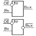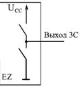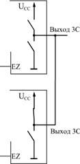 Перед описанием работы устройства студент должен уточнить особенности его работы, которые существенным образом будут влиять на схемотехнические решения и последовательность работы, как отдельных блоков, так и всего устройства. Для примера, рассматриваемого в пособии, такими особенностями являются: 1. Количество сравниваемых чисел (N) задается двоичным кодом внешними переключателями и, естественно, должно быть задано до начала работы устройства. 2. До начала работы устройства должен быть определен тип вывода результата: в прямом (Пр) или обратном кодах (Обр). 3. Паритет представляет собой результат сложения по модулю два (логический элемент XOR) всех разрядов числа, например, для двоичного числа 1001 0001 1011 0011 паритет равен 0. Для контроля правильности ввода информации необходимо после ввода информации определить бит паритета (Прасч) и сравнить его с введенным битом паритета (Пвв). Если паритеты не совпадут, то необходимо предусмотреть индикацию «ОШИБКА ВВОДА» и остановить работу устройства (выйти в режим «ОСТАНОВ»). 4. После окончания обработки всех N чисел устройство выходит в режим «ОСТАНОВ». 5. Запуск работы устройства целесообразно осуществлять внешним переключателем «СТАРТ». Сигнал «СТАРТ» должен быть подан после задания N (заданное количество обрабатываемых чисел) и определения типа вывода информации Пр (Обр) на переключателях. 6. Для хранения промежуточного и конечного результатов сравнения чисел необходим «Модуль хранения результата». 7. Для организации обработки всех N чисел необходимо обеспечить циклическую работу устройства. Для того, чтобы циклы по обработке первого и N-ого числа были идентичными, целесообразно первое введенное число сравнивать с заведомо минимальным числом, предварительно записанным в «Модуль хранения результата». Минимальное число в «Модуль хранения результата» должно быть записано до начала обработки первого числа. Минимальным числом будет являться число 0. 8. В соответствии с заданием на курсовое проектирование шины ввода и вывода имеют три состояния, что требует определенных схемотехнических решений. Выход с тремя состояниями или выход с возможностью отключения (обозначается 3С) очень похож на стандартный выход (обозначается 2С), который принимает состояние логического 0 или логической 1. В выходе 3С к этим двум состояниям добавляется еще и третье – пассивное, в котором выход можно считать отключенным от последующей схемы. Такой выход можно считать состоящим из двух переключателей (рисунок 2.1, а), которые могут замыкаться по очереди, давая логический ноль и логическую единицу, но могут и размыкаться одновременно. Третье состояние называется высокоимпедансным или Z-состоянием. Для перевода выхода в третье Z-состояние используется специальный управляющий вход, обозначаемый чаще всего OE (рисунок 2.1, б) (Output Enable – разрешение выхода) или EZ (Enable Z-state – запрещение выхода). Входы типа 3С можно соединять параллельно (рисунок 2.1, с) при условии, что в любой момент времени активным может быть только один из них. В этом случае отключенные выходы не мешают активному формированию сигнала в точке соединения выходов. Эта возможность позволяет применять элементы 3С в системах, где многие источники информации поочередно пользуются одной и той же линией связи.