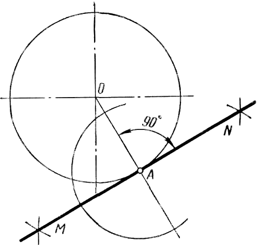 ПОСТРОЕНИЕ КАСАТЕЛЬНЫХ И КАСАНИЕ ОКРУЖНОСТЕЙ Подобное построение основано на том, что касательная перпендикулярна к радиусу окружности, проведенному в точку касания. Построение касательной к окружности в заданной на ней точке A (рисунок 43).Через точку A и центр окружности О проводят прямую и в точке А восстанавливают перпендикуляр к радиусу OA. Проведенный перпендикуляр MN и является искомой касательной.