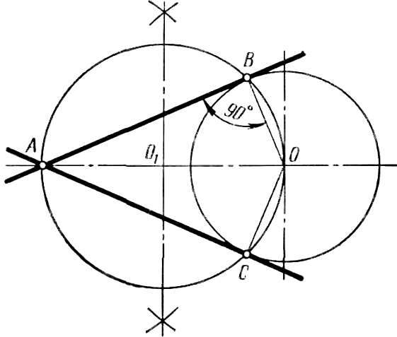Рисунок 43 Построение касательной к окружности, если точка A задана вне окружности (рисунок 44). Центр окружности О и точку A соединяют прямой. Отрезок OA принимают за диаметр вспомогательной окружности. Разделив отрезок OA пополам, получают точку O1 и из нее как из центра описывают вспомогательную окружность радиусом O1A. Вспомогательная окружность пересекает заданную в точках B и C. Прямая, проведенная через точки А и B, будет касательной к окружности, так как угол АВО прямой как вписанный в окружность и опирающийся на ее диаметр. Прямая АС является второй касательной к заданной окружности.