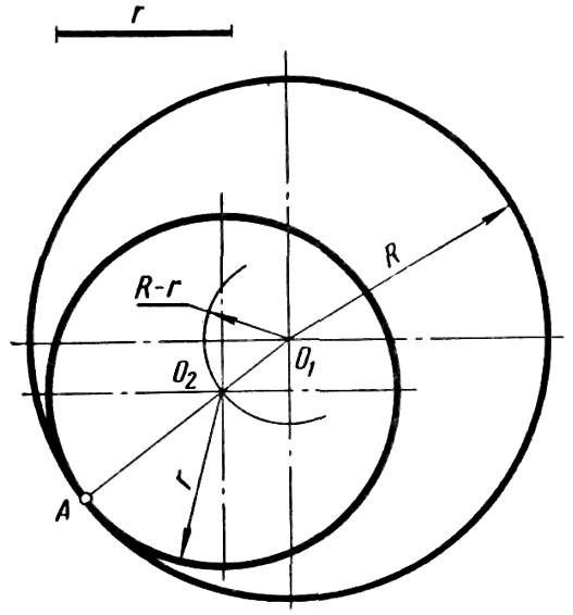 Внутреннее касание окружностей (рисунок 45, б) характеризуется тем, что центры касающихся окружностей O1 и O2 располагаются по одну сторону от общей касательной MN, проведенной через точку касания А, а расстояние между центрами касающихся окружностей равно разности радиусов R - r. Точка касания A окружностей в этом случае расположена на продолжении прямой, соединяющей их центры. Построение окружности радиусом r, касающейся окружности радиусом R в данной на ней точке А. На рисунке 46 показано построение внутреннего касания окружностей. Точку A и центр O1 заданной окружности соединяют прямой. Радиусом R – r из центра O1 проводят дугу до пересечения ее с прямой O1A в точке O2. Точка O2 является искомым центром окружности радиуса r.