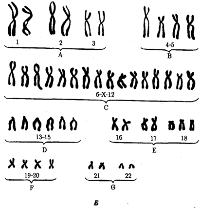 Денверська класифікація хромосом: Група А — 1—3 пари хромосом, великі метацентричні. Група В — 4—5 пари хромосом, великі субметацентричні. Група С — 6—12 пари хромосом, середні субметацентричні. Група D — 13—15 пари хромосом, середні акроцетричні. Група Е — 16—18 пари хромосом, малі субметацентричні. Група F — 19—20 пари хромосом, малі метацентричні. Група G — 21—22 пари хромосом, малі акроцентричні. Х-Хромосома належить до групи С, Y-хромосома — до групи G.