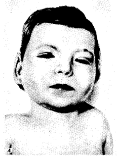 Мал. 8. Особливості будови обличчя з синдромом котячого крику у віці 8 міс (A), 2 роки, (B), 4 роки (C) і 9 років (D).