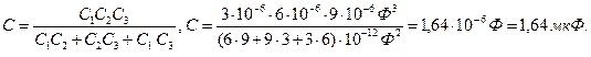 Решение. Из формулы последовательного соединения конденсаторов 1/С=1/С1+1/С2+1/С3 определим емкость батареи: