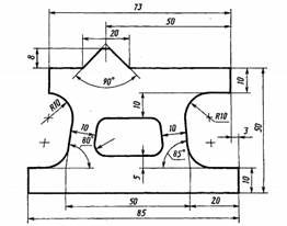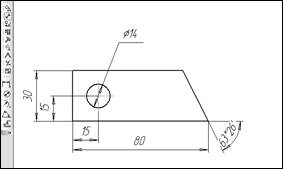 В КОМПАС нанесение размеров осуществляется следующим образом: · Создается эскиз изделия, на который необходимо нанести размеры, и включаются привязки – «Пересечение» и «Центр»; · Нажатием на кнопку компактной панели «Размеры» активизировать панель инструментов размеры (рис. 21), которая содержит кнопки «Линейный размер», «Угловой размер» и т.д.; · Проставим линейный размер – нажмем соответствующую кнопку и из всплывающего меню выберем способ простановки линейного размера («Линейный размер»). Внизу в панели свойств выберем ориентацию размера – горизонтальный. После этого наведем курсор на левую границу основания контура эскиза и нажмем левую кнопку мыши. Аналогично поступим с правой границей основания и получим размер основания. Размерное число проставляется автоматически. Чтобы проставить размеры, определяющие положение оси отверстия, необходимо совмещать курсор с центром отверстия и левой границей основания; · Проставим диаметр отверстия – для этого нажмем кнопку «Диаметральный размер» и запустим панель свойств. Выделим курсором контур отверстия и нажмем левую кнопку мыши – в поле эскиза появится нужный размер. Для того чтобы правильно расположить размерное число выберем вкладку «Параметры» панели свойств и выберем опцию «Размещение текста» - во всплывающем окне выберем пункт «На полке справа»; · Проставим угловой размер – нажмем кнопку «Угловой размер» и из всплывающего меню выберем нужный тип размера («Угловой размер»). Выделим отрезки контура изделия, между которыми необходимо проставить размер, и перемещая курсор определим положение размерной линии и размерного числа относительно контура эскиза. Эскиз с проставленными размерами приведен на рис. 21.