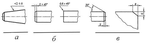 Размеры фасок, нанесенных под углом 45°, наносят, как показано на рис. 17б. Первая цифра показывает высоту конуса, формирующего фаску, вторая – угол фаски. Размеры фасок, выполненных под другими углами, указываются линейным и угловым, либо только двумя линейными размерами (рис. 17в).