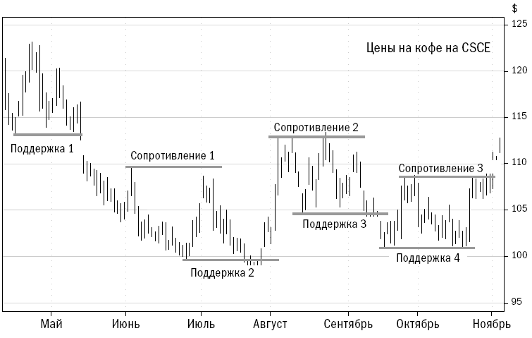 Концепция поддержки и сопротивления является фундаментальной практически для всех видов трейдинга. Поддержка и сопротивление представляют собой всего лишь тенденцию цен не превышать предыдущие уровни. Диаграмма движения цен на кофе на рисунке 6–1 наглядно иллюстрирует данную концепцию. Поддержка и сопротивление являются следствием рыночного поведения, которое, в свою очередь, вызвано тремя когнитивными предубеждениями: привязыванием, предубеждением в пользу недавних событий и эффектом распоряжения. Рисунок 6–1. Движение цен на кофе, май – ноябрь 2000 г. Уровни поддержки и сопротивления
