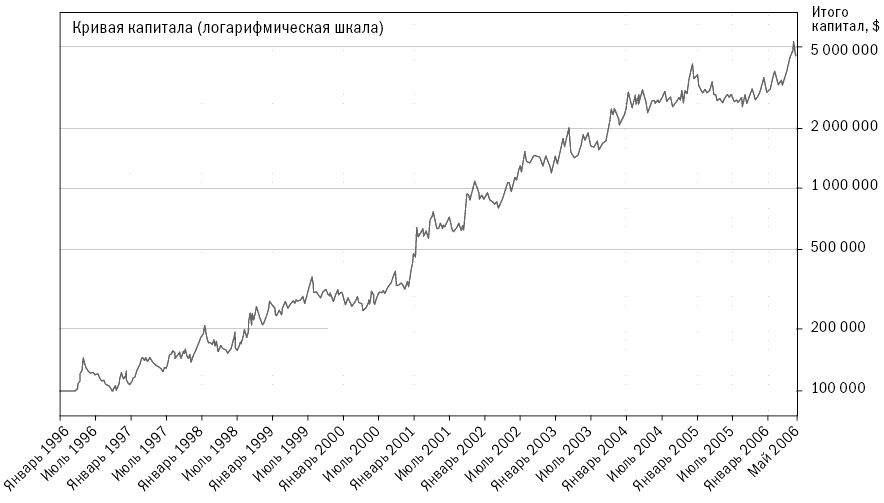 Ключевой и, возможно, единственный вопрос при рассмотрении торговли по системе или при поиске посредника, использующего систему: как узнать, что система или управляющий фондом достаточно хороши? В целом ответы, принятые в нашей отрасли, так или иначе вращаются вокруг одного – это система или менеджер, у которых самое лучшее соотношение риска и доходности. Каждый стремится к тому, чтобы заработать максимальную сумму при заданном уровне риска или иметь минимальные риски для запланированного уровня прибыли от сделки. С этим согласны все: трейдеры, инвесторы, управляющие фондов. Однако существует множество мнений относительно наилучших способов измерения составляющих в вышеупомянутом соотношении риск/доходность. Иногда финансисты игнорируют некоторые риски, и в результате получают от этих рисков пинка. Огромные потери, понесенные в результате падения компанией Long-Term Capital Management,[10]красноречиво свидетельствуют о рисках, существовавших вне пределов традиционного измерения. В данной главе мы рассмотрим такие риски и способы их учета, а также поговорим об общих инструментах расчета риска и отдачи в торговых системах с учетом исторических данных. Рич и Билл серьезно беспокоились из-за размеров наших позиций. Они знали, что если позиции слишком велики в периоды значительных движений цен, существует риск потерять все. За несколько лет до начала программы Черепах им довелось торговать на рынке серебра, когда он был лимитирован в течение многих дней. Это означало отсутствие возможности выхода, так как ни один трейдер не желал покупать в условиях ограничений максимального изменения цены серебра, наложенных в то время Нью-Йоркской товарной биржей (COMEX) на операции с фьючерсами. Такая ситуация – самый страшный кошмар трейдера по фьючерсам. Каждый день вы теряете все больше и больше денег и ничего не можете с этим поделать. К счастью, Рич успел сократить свою позицию до того, как это случилось, и, возможно, его действия сберегли ему десятки миллионов долларов. Если бы он промедлил, мог бы все потерять. Думаю, что воспоминания об этом событии были свежи в памяти обоих наших наставников во время программы Черепах. Рич постоянно наблюдал за позициями Черепах и в случаях, когда считал совокупный риск слишком большим, снижал размер своих позиций. Хотя Рич в кругу знавших его слыл эдаким ковбоем, на моей памяти он всегда очень осторожно относился к своим рискам. Рисунок 7–1. Результаты использования системы тренда Дончиана за период с января 1996 года по май 2006 года