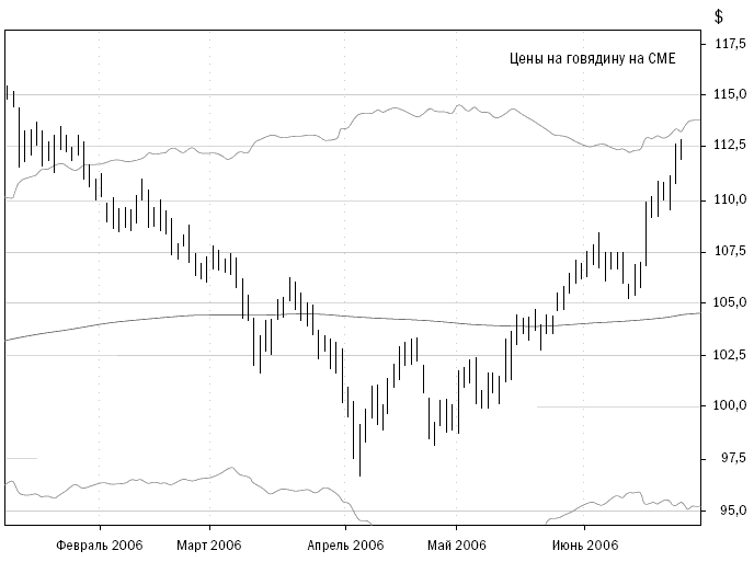 Прорыв канала ATR – это система изменчивых каналов, использующая среднее истинное значение в качестве показателя изменчивости. Канал формируется следующим образом: для верхней границы берется значение 7 ATR для 350-дневной скользящей средней по ценам закрытия, а для нижней – от скользящей средней отнимается значение 3 ATR. Длинная позиция открывается при открытии рынка в случае, если цена закрытия предыдущего дня превышает верхнюю границу канала. Короткая позиция открывается, если цена закрытия предыдущего дня была ниже нижней границы канала. Сделки закрываются, если цены закрытия пересекают скользящую среднюю. Популярной разновидностью этого метода является PGO (Pretty Good Oscillator) – система трейдера Марка Джонсона, представленная на форуме Chuck LeBeau's System Trader's Club (www.traderclub.com). Эта система включает в себя элементы системы прорыва Боллинджера, описанной ниже. На рисунке 10-1 изображен график канала неопределенности для системы прорыва канала ATR. Средняя линия – это 350-дневная скользящая средняя, а верхняя линия – это верхняя граница канала неопределенности, полученная путем прибавления значения 7 ATR к значению скользящей средней. Рисунок 10-1. Система прорыва канала ATR