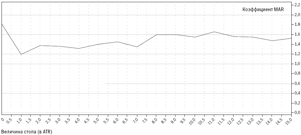 Многие трейдеры чувствуют себя некомфортно, не имея возможности устанавливать стопы. Как вы думаете, что произойдет с результативностью системы двойной скользящей средней, если к ней добавить стопы? Многие любят об этом рассуждать, спрашивать друзей или обращаться к более опытным трейдерам за ответом. На рисунке 10-6 отображен эффект использования стопов различной величины, выраженных с помощью ATR от точки входа. Рисунок 10-6. Эффект стопов в системе двойной скользящей средней: изменение коэффициента MAR в зависимости от величины стопа