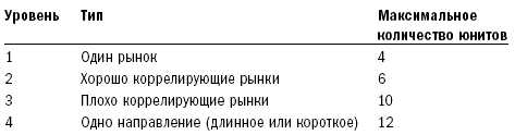 Поскольку Черепахи использовали юниты в качестве базовой единицы размера позиции и поскольку эти юниты учитывали риск волатильности, то юнит выступал одновременно как мера риска позиции и всего портфеля позиций. Черепахам были даны правила управления риском, ограничивающие количество юнитов, поддерживаемое в любой момент времени, на четырех различных уровнях. По сути, эти правила контролировали общий риск, который мог выдержать трейдер, а ограничения минимизировали потери в течение продолжительных периодов убытка, а также во время экстраординарных ценовых движений. Примером экстраординарного движения является следующий день после дня краха фондового рынка в октябре 1987 года. Федеральный резервный банк США резко снизил на несколько процентов ставки, для того чтобы активно поддержать доверие фондового рынка и страны в целом. Черепахи имели длинные позиции по процентным инструментам: евродоллару, казначейским облигациям и казначейским векселям. Потери следующего дня были огромными. В большинстве случаев за один день мы потеряли от 20 до 40 процентов величины торговых счетов. Но эти потери были бы гораздо выше, если бы мы не выставили ограничений на размер позиции. Лимиты были следующие: