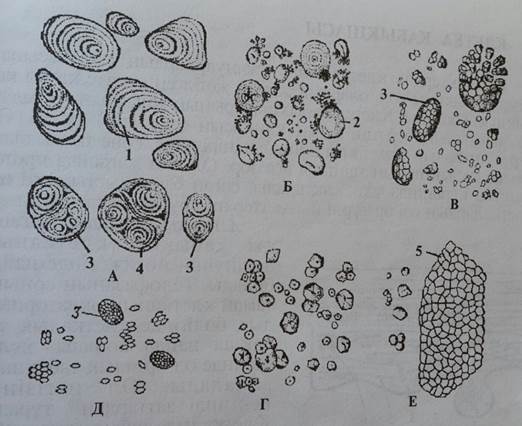 25-сурет. Әр түрлі өсімдіктердің крахмал дәндері: А-картоп; Б-бидай; В-сұлы; Г-жүгері; Д-күріш; Е-қарамық (гречиха): 1-қарапайым эксцентрлік дән; 2-қарапайым шеңберлі дән; 3-күрделі дән; 4-жартылай күрделі дән; 5-клетканың кескініне жай дәндердің жиынтығы. Крахмал дәндерінің формасы, мөлшері, құрылысы өсімдіктердің әрбір түрлеріне, кейде тіптен әрбір сортқа ерекше тән болып келеді. Бұл жағдайды ұнның құрамына анализ жасағанда үнемі ескеріп отырады. Шыны май тамшылары. Шыны май тамшыларының формасы сфера тәрізді болып келеді және олар гиалоплазмада жиналады (26-сурет). Олардың саны мен мөлшері клеткаларда ауытқып отырады. Шыны майының тамшылары барлық органдардың клеткаларында кездеседі, әсіресе дәндер мен жемістер оған аса бай болады.