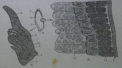 119-сурет. Сұлының дәні: А-тік кесіндісі (сызба – нұсқасы); Б-ұрық; В-эндосперм: 1-ұрық; 2-эндосперм; 3-спермодермамен біріккен жеміс қап; 4-сабақша; 5-тамырша; 6-колеориза (тамыр қынап); 7-бүршікше; 8-колиоптиль; 9-тұқымжарнағы (қалқанша-щиток); 10-эпибласт; 11-алейрон қабаты; 12-қорлық крахмалдары бар клеткалар.
