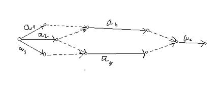 Далее строят ориентированный граф. Дуги графа являются операциями, а вершины – событиями. Операции изображают сплошными линиями. В графе могут быть дуги, которые являются связями. Они изображаются пунктирными линиями. Временем наступления события считают время, когда завершено выполнение всех операций, входящих в соответствующую вершину.