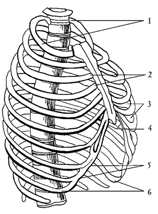 Рис. 3. Грудная клетка: 1 – верхняя апертура; 2 – грудино‑реберные суставы; 3 – межреберье; 4 – подгрудинный угол; 5 – реберная дуга; 6 – нижняя апертура