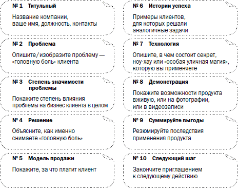 Современная структура продающей презентации – это перечень контрольных точек маршрута, по которым в обязательном порядке должен проследовать успешный презентатор. Метафора для описания сути базовой структуры продающей презентации – медицинская. «Диагноз такой‑то, лечим так‑то, через месяц – здоров как бык». Сначала вы описываете проблему, «головную боль» клиента. Затем демонстрируете, как с помощью продукта можно решить эту проблему и соответственно избавить «больного» от недомогания. Цель – дать столько информации, сколько нужно для перехода на следующий уровень взаимоотношений. И не более того! Ниже перечислены 10 опорных точек‑слайдов (см. также форзац книги) для построения нужной структуры.
