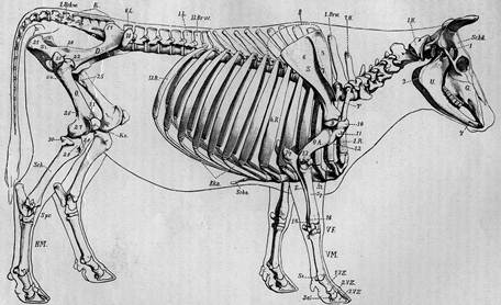 Рис. 2. Скелет коровы. А – скелет туловища; Б – осевой скелет; В – скелет головы; Г – скелет конечностей