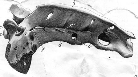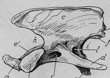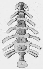 a – crysta ventralis - b – caput vertebrae – c – fossa vertebrae - d – processus transversus – e – foramen transversus - f – processus articularis cranialis – f´- processus articularis caudalis – g – incisura vertebrales craniales – g´ - incisura vertebrales caudales – h – processus spinosus (rudimentum) -