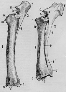 Рис. 13. Кости предплечья следующих видов животных: А - Б - В - Г - 1 – 2 - a – b - c – d – e – f – g- h – i – i´ - k – ! Задание 13. Изучить строение и видовые особенности костей предплечья. Напротив буквенных обозначений проставить русские и латинские названия частей костей.