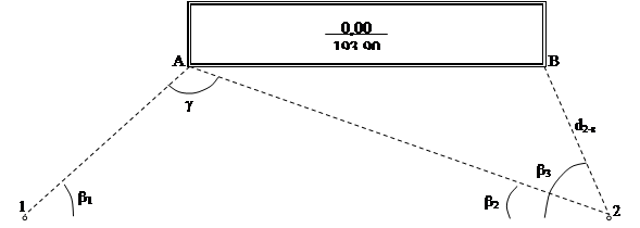 В учебных целях работу выполняют в следующем порядке. 1.Из ведомости координат точек теодолитного хода выписывают координаты точек 1 и 2, горизонтальное расстояние между ними и дирекционный угол линии 1-2. Таким образом, для расчетов известны: Х1, Y1, X2, Y2, d 1-2, a1-2, dАВ = 72.000 м. Следует найти: b1 и b2 - для выноса в натуру точки А способом угловой засечки; b3 и d 2-В - точки В способом полярных координат mА, mВ, md - для оценки точности геодезических построений.