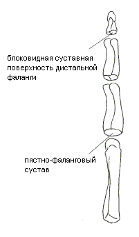 Рис 1.1 - 1.2. Кости левой кисти. Вид с ладонной и с тыльной сторон Сначала мы рассмотрим пальцы. Дистальная фаланга, phalanx distalis, каждого пальца имеет тело и два конца - дистальный и проксимальный. Тело почти плоское с ладонной стороны и выпуклое с тыльной, а по бокам, то есть по линиям соединения ладонной и тыльной поверхностей, имеет небольшие гребешки. Дистальный конец кости имеет округлую бугристость, проксимальный несет на себе блоковидную суставную поверхность (рис. 1.3).