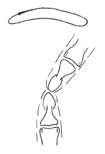 Рис 1.3. Кости 2-го пальца и 2-я пястная кость Массаж. Дистальную бугристость массируем двойным перекатом Стрелой аналогичным пальцем массажиста. При хорошо выполненном приеме бугристость чувствуется как массажистом, так и клиентом: обоим кажется, что как в массирующем, так и в массируемом пальце скрыто по шестеренке, и первая катится по второй (рис. 1.4). Рис 1.4. Массаж дистальной бугристости пальца Двойным перекатом Стрелой (внизу - палец клиента, сверху - массажиста) Тыльную сторону тела фаланги массируем двойным перекатом поперек тела.
