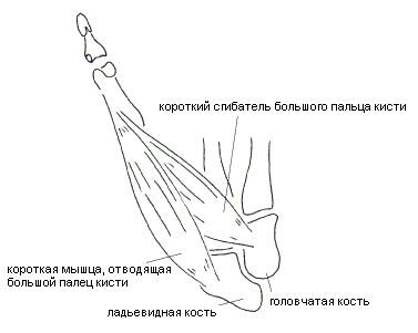 Рис 1.6. Маргинальные зоны левого запястья соединение кости-трапеции, трапециевидной и 2-й пястной костей; соединение головчатой, крючковидной и 4-й пястной костей; соединение ладьевидной, трапециевидной и головчатой костей; соединение ладьевидной, головчатой и полулунной костей; соединение полулунной, крючковидной и трехгранной костей; соединение ладьевидной, полулунной и лучевой костей. В заключение массажа костей запястья хорошо сделать критический конус и поперечное растяжение запястья в целом - как если бы оно было одним суставом - и в конце обязательно следует интегрировать его в руку в целом. Мышцы кисти. Автор напоминает читателю, что в этой книге рассматриваются лишь некоторые, главным образом, поверхностные, мышцы; читатель, желающий получить более полное представление о мышечной системе, должен обратиться к специальной литературе. Однако, знание даже только поверхностной мускулатуры и ее адекватный массаж несут большой оздоровительный эффект, в чем (автор надеется) читатель убедится на собственном опыте. Мы рассмотрим пять мышц, располагающихся в пределах кисти: три мышцы в области большого пальца и две - в области мизинца, места прикрепления мышц к сухожилиям и сухожильным растяжениям других мышц здесь и далее не указаны и на рисунках не обозначены. Короткая мышца, отводящая большой палец кисти, m. abductor pollicis brevis (рис. 1.7), прикрепляется в своем проксимальном конце к ладонной поверхности ладьевидной кости, в дистальном - к ладонно-боковой поверхности основания проксимальной фаланги большого пальца.