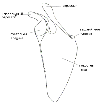 Рис 1.28. Левая лопатка. Вид сзади Лопатка в целом, исключая два замысловатых отростка, представляет собой плоскую треугольную кость, располагающуюся углом вниз за верхними ребрами (от 2-го до 8-го), сзади и несколько латерально по отношению к туловищу. У нее различают верхний край (тонкий), медиальный край (несколько толще) и латеральный край, к которому лопатка существенно утолщается. Особенно это относится к ее верхнему отделу, где находится латеральный угол лопатки, на латеральной поверхности которого располагается чуть вогнутая суставная впадина, соединяющаяся вместе с головкой плечевой кости в плечевой сустав. Суставной впадине предшествует небольшое, типа канавки, сужение латерального угла - шейка лопатки. Верхний угол лопатки расположен вверху ее медиального края; сразу вслед за ним в латеральную сторону и несколько вниз идет верхний край лопатки, от которого (близ суставной впадины) отходит округлый клювовидный отросток, который вначале идет медиально и вверх, а затем быстро выгибается латерально и чуть вниз.