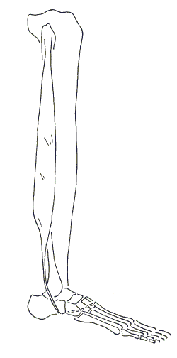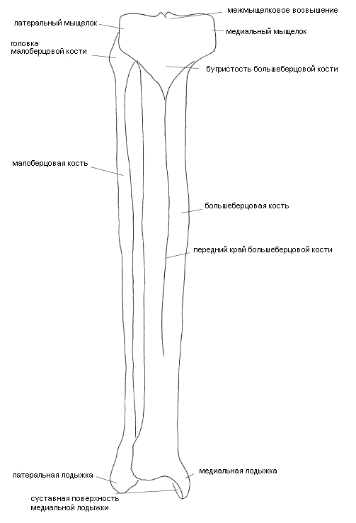Рис 2.10. Кости правой голени. Вид спереди Большеберцовая кость, tibia, довольно велика. Она обладает вытянутым телом и двумя концами - проксимальным (верхним) и дистальным (нижним). Тело кости в поперечном сечении округло, но имеет острый передний край, легко прощупываемый под кожей, в медиальную сторону от которого находится медиальная поверхность кости, по большей части расположенная непосредственно под кожей, то есть не прикрытая мышцами.
