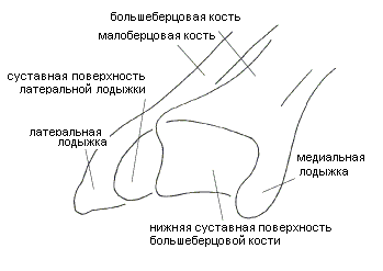 Рис 2.11. Дистальный концы берцовых костей Дистальный конец кости довольно массивен (рис. 2.11). На его латеральной поверхности находится глубокая малоберцовая вырезка, в которую входит медиальная часть нижнего конца малоберцовой кости, расположенная проксимально рядом с суставной поверхностью лодыжки последней. С медиальной стороны дистальный конец кости имеет короткий, но массивный отросток - медиальную лодыжку, на латеральной стороне которой расположена суставная поверхность лодыжки, граничащая с медиальной суставной поверхностью таранной кости. Суставная поверхность лодыжки плавно переходит в вогнутую в передне-заднем направлении нижнюю суставную поверхность большеберцовой кости, расположенную на дистальной оконечности последней и соприкасающуюся с верхней суставной поверхностью блока таранной кости (рис. 2.12).