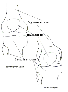 Рис 2.20. Коленный сустав. Вид спереди По боковым сторонам бедра на уровне надколенника легко пропальпировать латеральный и медиальный надмыщелки, заканчивающиеся в дистальном направлении латеральным и медиальным краями суставной щели коленного сустава. При полностью согнутом колене по бокам от верхушки надколенника можно под толстым сухожилием четырехглавой мышцы бедра прощупать мыщелки бедра на существенном их участке; при этом четко определяется граница между гладким мыщелком и выпукло-бугристым надмыщелком. Тело бедренной кости лучше прощупывается с латеральной стороны вплоть до большого вертела, который при расслабленных мышцах худощавого бедра удается пропальпировать со всех сторон, определив его переднюю, проксимальную (верхнюю) и заднюю границы. Большой вертел находится с латеральной стороны бедра на уровне лобка стоящего человека. Массаж надколенника и бедренной кости. Переднюю поверхность надколенника массируем, придерживая его с боков, эллиптическим массажем Ковшиком. По его краям - боковому, дистальному и проксимальному - идем Стрелой двойным перекатом. Суставную поверхность притираем, прижимая поочередно латеральную и медиальную ее части к надколенниковой поверхности бедренной кости и перемещая надколенник (нога разогнута в колене) вверх-вниз в проксимально-дистальном направлении. Поперечное растяжение в данном суставе можно делать следующим образом: согнув пальцы обеих рук в Ковшик, мы вводим их между боковыми краями надколенника и бедренной костью, как бы оттягивая первый вперед от второй. Затем, сохраняя это усилие, двигаем надколенник в латерально-медиальном и проксимально-дистальном направлениях. Из той же позиции можно делать массаж суставной щели, но Ковшики следует превратить в Гребешки, осуществляя ими синхронные двойные перекаты. Массаж дистального конца бедренной кости проводим Ковшиком (или двумя сразу) с медиальной и латеральной сторон бедра эллиптическим массажем в тех местах, где кость еще прощупывается под кожей: это в основном надмыщелки и передняя и передне-боковая части поверхности мыщелков - последние открываются для массажа при сильном сгибании колена. Кроме того, можно пройти фронтальным Ковшиком по латеральному краю бедра вдоль тела кости до большого вертела включительно и обозначить его края двойным перекатом Стрелой большого пальца. Массаж коленного сустава очень важен, так как в последнем заключена громадная скрытая сила; как писал И. Бродский: "... зачем вся дева, раз есть колено". Однако следует помнить, что в этом суставе участвуют не только большеберцовая и бедренная кости, но также и надколенник, и обязательно включать в массаж определенные манипуляции с ним (например, типа описанных выше). Притирание большеберцовой кости к бедренным мыщелкам лучше производить в два этапа, притирая ее сначала к одному из них, а затем к другому. Для этого следует сначала несколько отвести голень в боковую сторону и затем прижать ее к бедру (коленный сустав немного согнут), после чего сгибать-разгибать колено. Поперечное растяжение в коленном суставе описано в "Эзотерическом массаже". Массаж суставной щели между большеберцовой и бедренной костями можно производить двумя способами: входя в нее двумя Гребешками с боковых сторон или же спереди и сзади, то есть со стороны подколенн